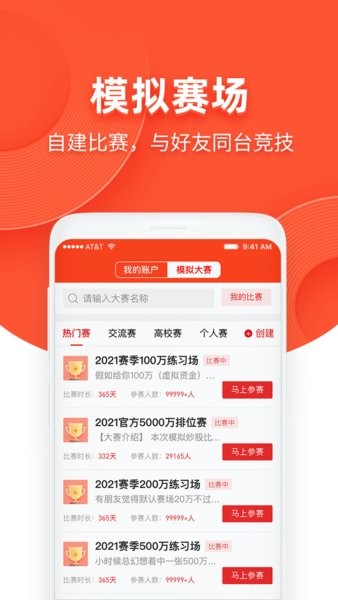 每天都有众多模拟大赛诞生和开展,通过详细的牛人榜单,学习炒股技巧,跟随牛散交易,或者自主创建比赛邀请小伙伴切磋,说不定下一个民间股神就是你!
