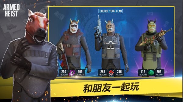打造你专属的无情银行劫匪!想成为杀手小丑?想加入特种部队?还是想成为恶棍匪徒?赢取成套面具、防弹背心和酷炫服装。高清的3D画面和身临其境的情节设计,让这款第三人称射击游戏变成了一场激动人心的枪战!"