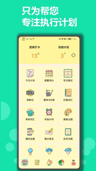 单个计划有进度标记,全盘计划有统计图表,更有专注时钟辅助记录耗时。