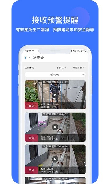 接收预警提醒,查看危险事件的监控视频,预防猪场未知安全隐患;