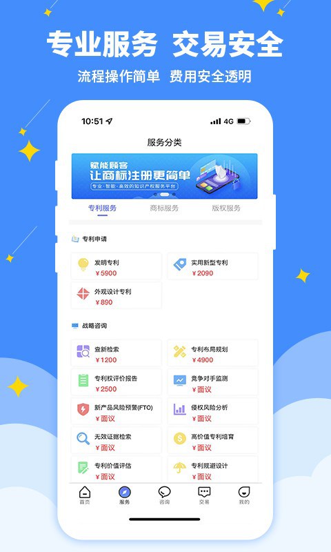 专大师专利服务软件为大家带来专业智能高效的知产服务平台,提供一直那是的知识产权服务,包括专利交易、商标服务、版权服务。法律服务等,支持在线交易,产权转让,申请专利,还提供战略咨询功能,海量产品资源明码标价,各种推广运营更加便捷!