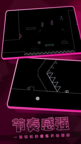 霓虹节奏是2d音乐节奏游戏。游戏采用十分简约的霓虹风格画面,并且将音乐节奏与平台跳跃玩法相结合,为玩家精心设计了四个不同的关卡。在游戏中玩家需要控制一个小方块在平台上进行跳跃闯关,玩法虽然很简单,但是通关难度很高,十分考验玩家的反应能力。