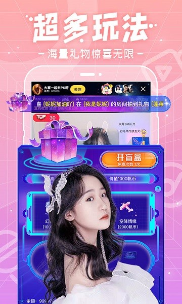 独创爆灯玩法,开启酷炫爆灯特效,帮主播登上全站头条;连麦PK互动玩法升级,各类才艺精彩纷呈,让用户尽情玩耍。