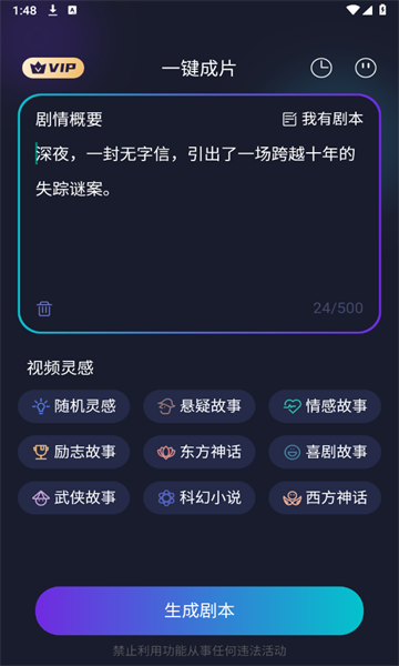 -- 如果想要文本生成视频,就点击【一键成片】,输入文本后点击【生成剧本】即可