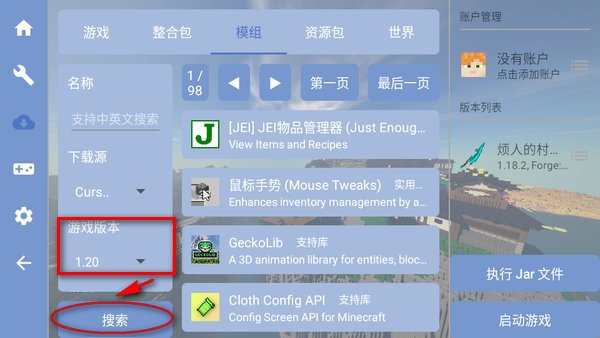 “游戏版本”可以选择自己玩的我的世界版本,点击“搜索”,就可以找专属模组;