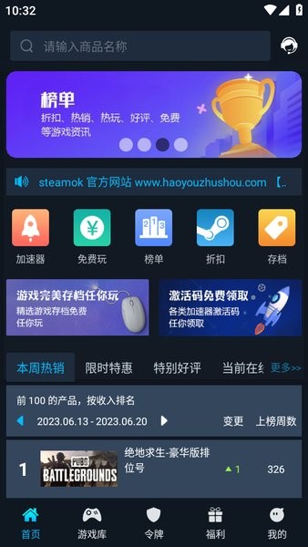 1.在首页界面可以查看免费游玩的游戏,游戏榜单,游戏折扣和可使用存档的游戏等。