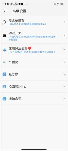 软件里有十几种不同的手势动作,还能添加快捷手势和应用保活设置,确保在后台不被停止。悬浮球功能也很实用,甚至比苹果的辅助触控还多了些功能。通知盒子可以过滤消息,控制中心还可以自定义小部件,最多加32个,动画样式也有五种选择。