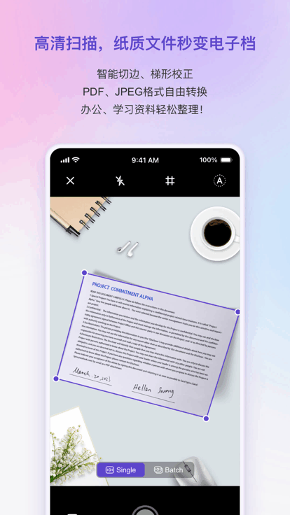 2、扫描文档:通过手机相机拍摄纸质文档,并自动识别边界和裁剪图像,确保扫描结果清晰。