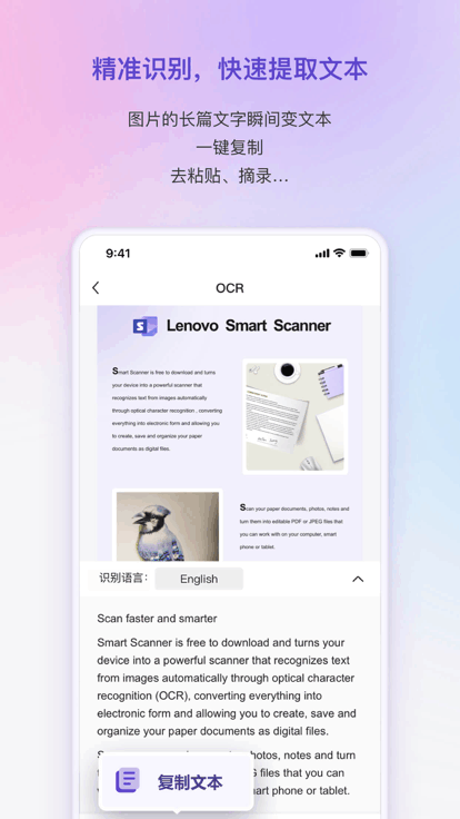联想扫描王(Lenovo Smart Scanner)免费下载,将您的设备变成一台功能强大的扫描仪,通过光学字符识别(OCR)自动识别图像中的文字扫描您的纸质文档、照片、笔记,并将其转换为可编辑的PDF或JPEG文件,以便在电脑、智能手机或平板电脑上使用。