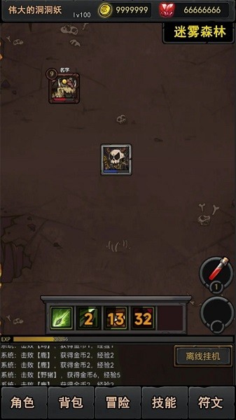 进入游戏需要手动选择地图挂机打野,选择下方“战斗”选择“迷雾森林”地图,砍鸡和猪到10级,升级的同时也打一些基础装备来提升自己,到5级的时候去第二个地图,去打10级装备,这样角色10级的时候就可以直接穿上,为打第一个地图的隐藏地图做准备。