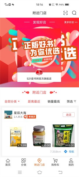 521爱书网通过定位,实现读者及消费者快速锁定附近门店,提升用户体验,并设有秒杀、优惠券、促销、每日签到送积分等活动。