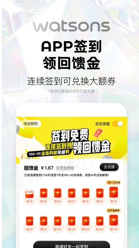 屈臣氏旗舰店手机版帮助大家可以直接在线上购买屈臣氏的商品,直接送货上门,无需去店里就能享受极致的服务。app中签到有着海量的奖励可以领取,想要获得对应的奖励就在这里查看吧,还有会员日福利可以解锁!