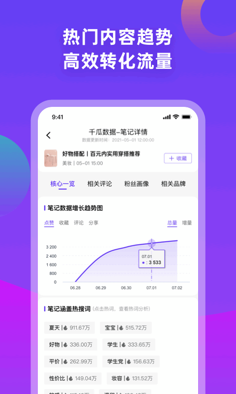 千瓜数据小红书数据分析平台是提供数据分析的应用app,功能内容丰富,实时跟踪,收录全面的数据,提供多维度分析,即时反馈,精准营销,深度挖掘,洞察特征偏好,高效转化流量,优化投放,好用又实用,助力企业发展推广!