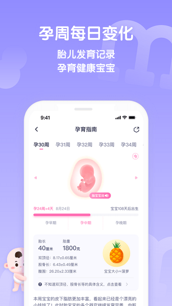 、胎儿每日生长状况,再到产后恢复、宝宝护理、宝宝辅食、坐月子餐饮食营养、胎教等等,