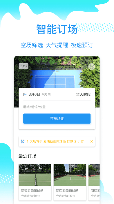 韵动吧已入驻多家社区,进行智能场地翻新服务,基于LBS定位系统与个性化匹配为你就近推荐专业网球场地,让你极速订场,贴心天气服务,更为你的网球运动增添便捷。