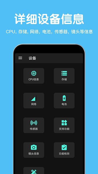 CPU设备信息,可实时显示设备的cpu型号信息,用户快捷通过本软件得知当前手机cpu的性能情况,软件包含工具多样,使用方便,支持对电池及设备其它系统进行测试,深度了解手机的功能状况,有需要的用户可以下载使用!