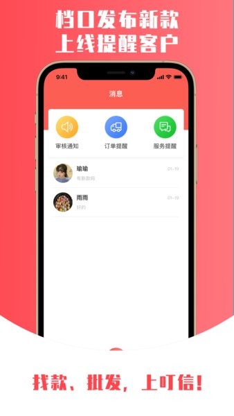 叮信服装批发app是专为做服装生意的商家打造的线上批发软件,平台提供了丰富的服饰,商户们可以随时浏览下单;为了方便大家紧跟潮流,每当有当口上架新款服装的时候,软件就会发送提醒给批发商,好让大家及时查看。