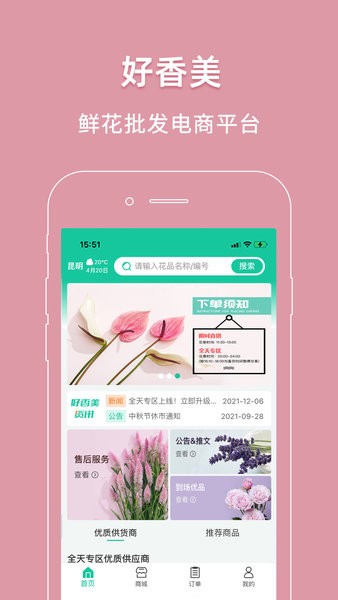 好香美鲜花网络交易平台是专为花店老板们打造的鲜花采购app;通过软件可以快速搜索需要的鲜花,这里的鲜花种类齐全,市面上的热门鲜花基本都有;因为是自产自销,所以在价格方面还是比较便宜的;鲜花质量也是完全没问题的。