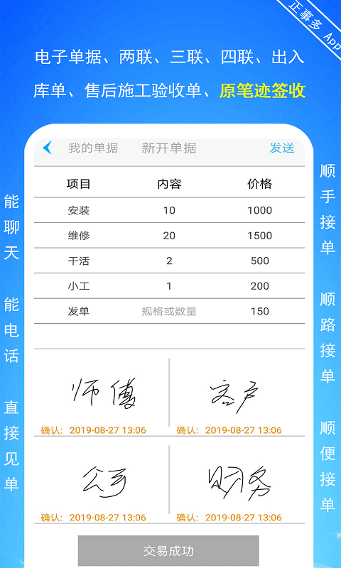 【接单派单接活】智能商务的功能,多种订单合同模式,不限行业、职业、工种,线上线下订单交易管理,派人接活 接单派活、电子单据收据,无纸化商务办公,原笔迹签字验收