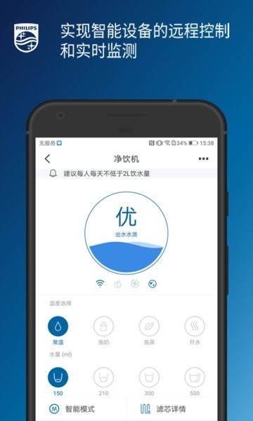 飞利浦水健康app是专门用于控制飞利浦旗下的智能物联设备软件,随着智能家居的引入,飞利浦也打造了相关的智能家居产品,通过安装配套的app,就可以利用手机控制这些设备,方便省事,畅享智慧生活。