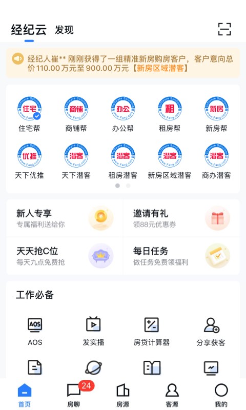 天下潜客:全新产品“天下潜客”,基于对房天下近亿用户海量找房行为的智能分析,为经纪人精准匹配并推送符合其需求的客户。精准、智能地整合房天下房源、客源信息,提高经纪人与购房者的沟通效率,有效降低获客成本。