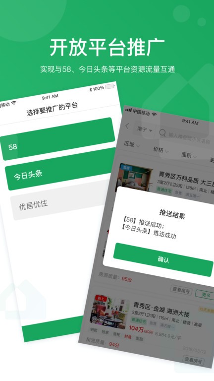 一键同步58、幸福里、房天下等流量平台;超完善的分享工具;实时结算系统佣金;完善的权证售后体系等