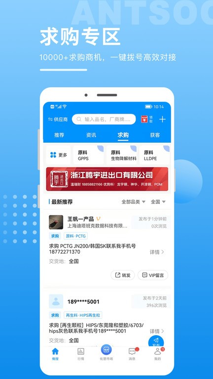 这个App叫“俺搜”,主要是帮塑料行业的人找客户、看行情、查价格,还能直接和供应商沟通交易。我觉得挺方便的,特别是能实时查看各种塑料材料的价格走势和市场数据,比如区域均价、进出口量啥的,对做生意很有帮助。
