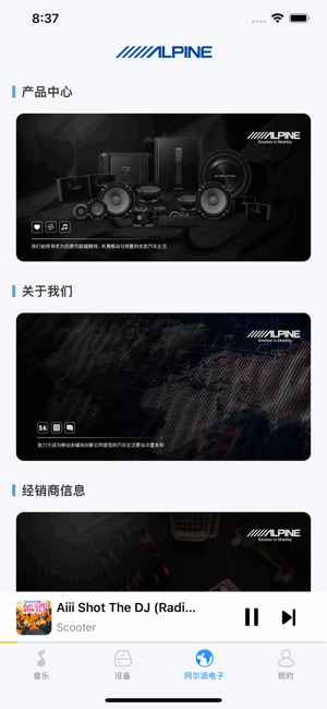 并在成功连接设备后,可轻松实现合频、EQ、延时等参数的专业调音。将原先每个型号单独的调音app集合到AlpineMusic一个APP中,更方便快捷还可通过AlpineMusic随时获取阿尔派最新信息,在会员广场进行粉丝交流互动。