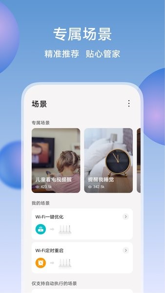 荣耀智慧空间app是荣耀手机打造的智能硬件控制系统。荣耀旗下的智能设备通过本app和手机连接后,就可以利用手机来控制硬件设备了,就在不需要遥控器了;比如用来控制wifi路由器、调节荣耀耳机等。