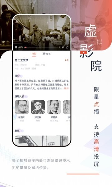 根据影片内容提供限量点播资源,播放形式除了手机端观看以外还支持高清投屏。但每个播放链接都将内嵌可溯源暗码技术,拒绝摄屏及网络传播。