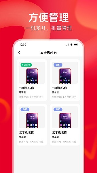 联通云手机客户端是中国联通旗下的官方云手机工具,支持一机多开,批量管理多个机型设备,还支持24小时挂机运行,显示设备基础信息和状态,支持一键加速,性能强劲,一键上云,更可以购买新云机,使用稳定流畅,操作简单!