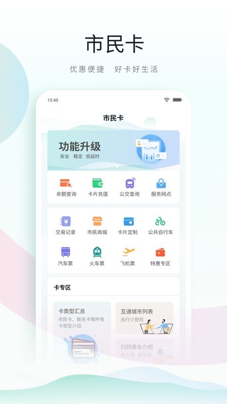 涵盖公共交通、地铁、出租、公共停车场、公共自行车、水、电、煤气、园林、旅游、商场、超市、加油、菜市场、休闲娱乐等,是数字城市、智慧城市建设的重要载体。该应用是以“便民、惠民、利民”为服务宗旨,以提升公共服务职能,建设市民卡服务平台为目标,整合社会资源,全面提升徐州市政府行政效能,提高数字城市服务保障能力和现代化管理水平