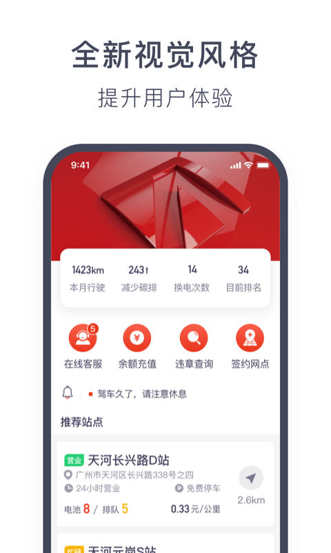 奥动换电app官方最新版中用户可以查看换电次数、本月行驶、减少碳排等数据,能查看附近的签约网点,每个站点的电池和排队人数一目了然,能按照排队数、电池、单价更因素来进行筛选排序,帮助用户快速找到合适的充电站进行换电。
