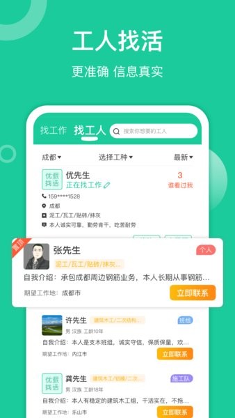 优派找活是一款专注建筑行业招聘求职找工作的信息发布平台,为您精准匹配招工与招聘信息,随时随地联系工人与老板,在线就能完成招工找活,工友轻松找到好工作,老板招工更加方便快捷。
