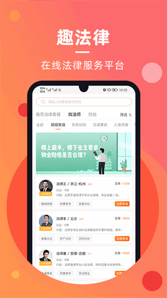 趣法律app,一款全新的法律服务软件,这里为大家带去了丰富全面的法律知识的同时还有大量的专业律师在线为大家服务,用户可以自由的在软件中查看律师简介,然后根据自己的需求自由进行法律咨询,解决各种法律难题,超级的方便好用,有需要的朋友快来下载试试看吧~