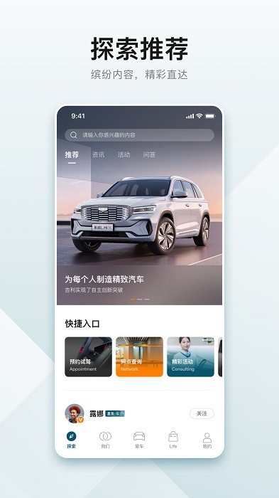 吉利汽车app官方版是由吉利推出的手机应用软件,用户可以在这里查看最新的汽车新品,可以查看附近的网点,了解最新的精彩以及优惠活动,车主可以直接在手机上远程控车,还能预约试驾哦!