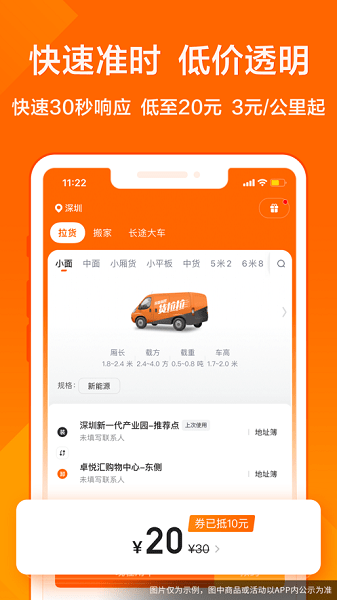 根据货量选择车型,平台涵盖小面包车到9米6大货车等多种车型可选(以城市实际开通情况为准);