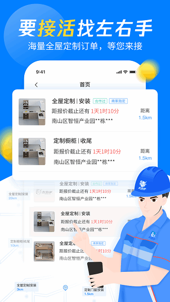 左右手师傅端app是一款专为家居安装师傅打造的在线接单神器,平台聚集了大量经过专业培训的师傅,技术过硬服务靠谱。用户只需手机下单,附近最合适的师傅就会很快响应上门服务,整个流程省心又高效。