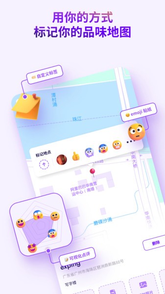不再是单一的地图标记,可以用各种好玩的 emoji、自定义地点标签和可视化点评标记地点。