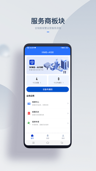 ivms-a100官方版是一款提供视频监控安防管理服务的应用软件,面向服务商和用户,带来全方位的布撤防服务,实时视频监测,支持语音对讲、抓拍录像,监控点情况随时掌握,支持维修、巡查上报,处理待办任务,查询相关资料,批量管理!
