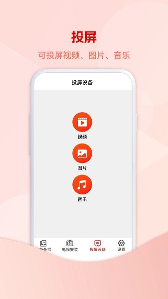 一款电视投屏软件,一键将手机里面的视频、图片、音乐投射到电视屏幕中。