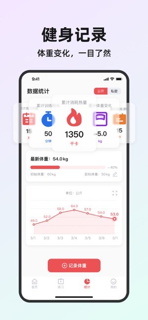 可以详细清晰的记录体重、身体围度等等数据,时刻关注自己锻炼的效果