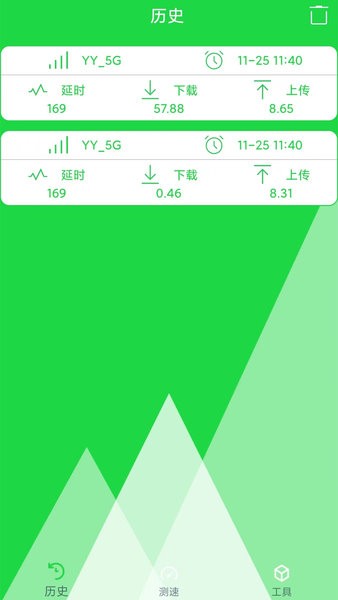 3.一键测速:下载速度、上传速度、网络延时图表实时跟踪显示。