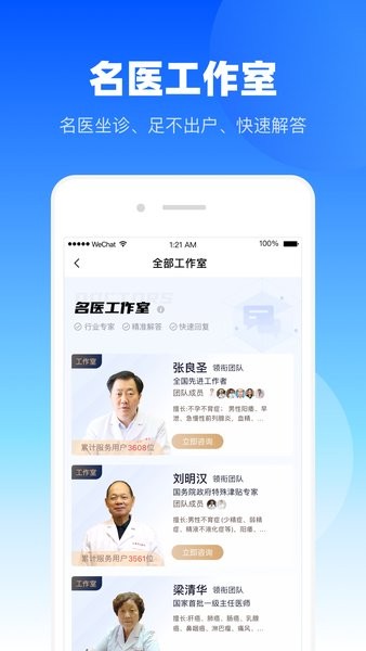 在线问诊开方:名医领衔,与团队成员为用户进行问诊诊断和复诊开方。