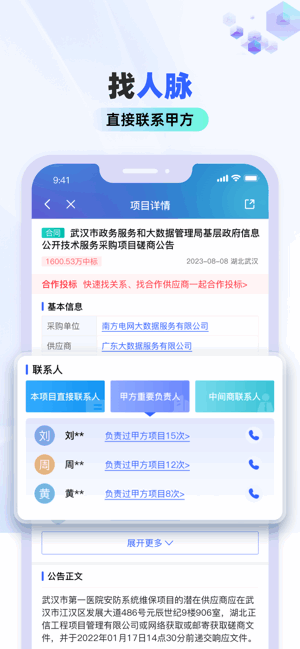 搜索获取甲方客户的联系方式、查找客户历史采招记录,查看与客户合作较多的供应商/采购代理机构,对客户的采招详情了如指掌!
