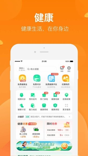 【线上就医】用户可在首页、发现菜单中享受免费问医生服务,包括导诊接待、选择医生、医生诊断、康复管理。