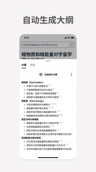 自动生成大纲、思维导图、相关事件/组织/人物表格,还能以PPT形式呈现,帮助快速掌握关键信息。