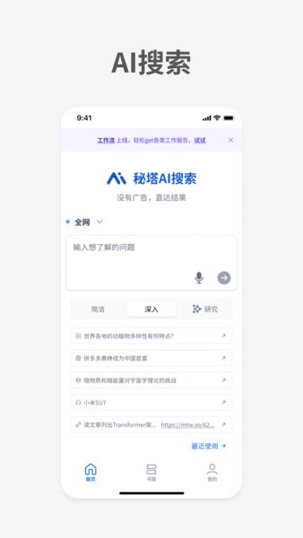 此外,秘塔AI还支持高效的工作流,覆盖7大类别和25个工作场景,如制作个人日报等。用户还可以通过上传文件定制专属搜索系统,并搭建知识库进行个性化扩展。软件亮点包括多轮对话、语音搜索、实时更新的知识库以及安全隐私保护。