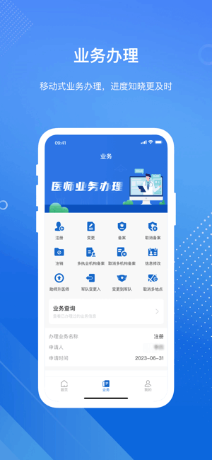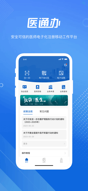 医通办APP是医师电子化注册移动工作平台,基于安全可信技术实现医师精准管理。