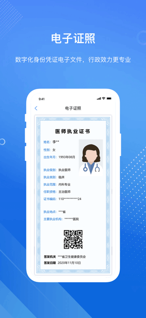 为全国医师提供电子化注册的实名、实人认证服务、状态变更实时查看;围绕医师电子化注册业务办理、科室维护、基本信息查看和信息发布平台;扫码、亮码、出示电子证照等服务。